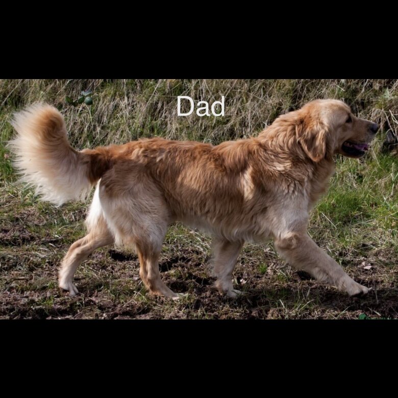Dad is the handsome and gentle Bruno. Bruno is from champion and extensively health tested lines. Bruno himself is fully health tested with excellent results. He has a current clear eye certificate, with Gonioscopy- PLA Grade 0. Hips BVA 0 - 2 Elbows BVA 0-0. Bruno has everything you could hope for in a stud. Low co-efficient, excellent breeding, handsome looks with a black nose, perfect conformation, golden colour, and most importantly a lovely gentle temperament.