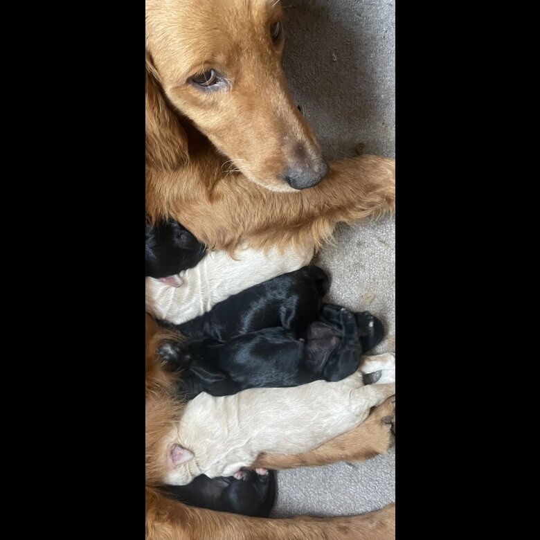 Hi and welcome to my advert I’m just so delighted to announce the safe arrival of are family fur baby Darcy’s beautiful 7 babies she’s proven to be the perfect mother all pups are healthy and thriving : about darcy she’s been in are family since she was 8 weeks old she’s the most loving caring girl she’s a kc registered golden retriever she’s not only are baby she’s my daughters therapy dog who goes to school with her all the kids love her this is Darcy’s first and only litter as one of my daughters friends parents are having one of the girls to be a therapy dog also for there son I just know your going to full in love with her as much as the pups when you come to visit us : Dad he’s was a very carefully chosen chocolate sable boy named bear he’s health tested clear and also kc registered we chose him for his gentle temperament to match Darcy’s to ensure these baby’s will be suitable for therapy dogs if this is something there new family’s would wish for them : About the baby’s they are he cuddled everyday by my self and 3 children we just love them there are 3 white boys 2 black boys and a black girl these fur baby’s will have the best start in life they will be very socialised we will start puppy pad training when timing is right they will be flead and wormed only with the best drontal they will be weaned onto Lilly’s kitchen when the time is right they will be vaccinated , health checked by a vet when there ready for there new family’s adventures I will update pics as they get older every week Please only message if your prepared to answer questions we have as I will expect you to ask questions also these pups will not just got to anyone if I feel your not right I will let you know as I want only best for them I am offering FaceTime viewings until they are 2 weeks old then after your more than welcome to come visit and have cuddles I strongly encourage you to bring something with your household scent on to leave with you chosen pup as this will help with the transition to there new home as they will already be familiar with you scent Please feel free to message or call I look Forward to speaking with you