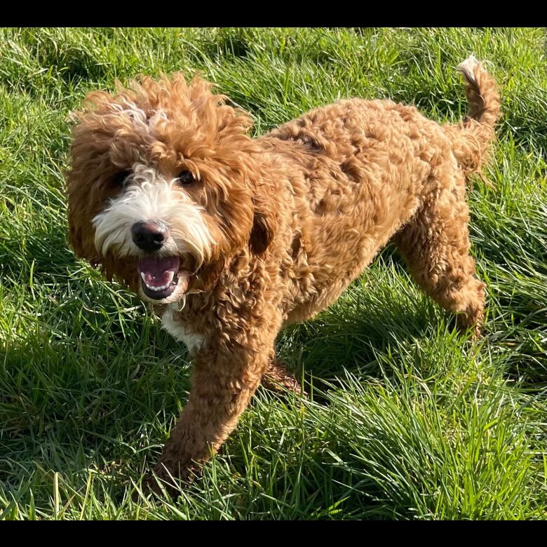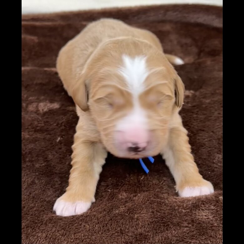 Blu is sired by Yogi Bear who is a 100% Australian labradoodle. and his dam is Eva a f1 medium Goldendoodle. Blu is 18 inches to his shoulder. He is Genetically clear of all common disorders related to a Australian Labradoodle and a Goldendoodle.