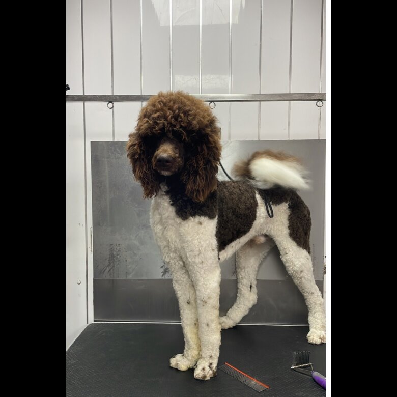Dad is our beautiful KC registered brown & white Standard Poodle "Teddy Panda Bear Oscar", DNA clear of Von Willebrand Type I, PRCD, Neonatal Encephalopathy & GM2.