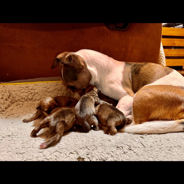 We’ve got a lovely litter of 3 miniature Jack Russell pups (2 girls, 1 boy) looking for their forever homes. Mum, Luna, is a chocolate, tan, and white Jack Russell from a long family line – affectionate, clever and full of that classic terrier spark. She’s the 4th generation raised in our family, and these pups make the 5th – a well-loved, home-bred line known for being lively, loyal, and people-focused. Luna’s been DNA tested clear for 30 conditions and carries low-shedding genes.