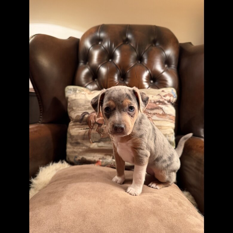 4 . Barkmoral Felix Felicis (Arty/ Arthur) £1750 - Blue tan and white boy - blue face with lower half white and white arrow from forehead down towards his nose, one small white patch from his spine down his right side, and a blue and white tail.