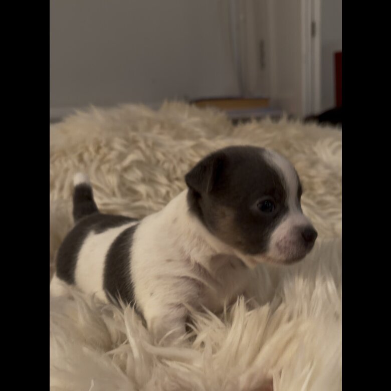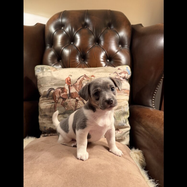 5. Barkmoral Under The Mistletoe (Misty) - Blue tan and white girl with 'traditional' level of JRT white markings and lots of blue dots.