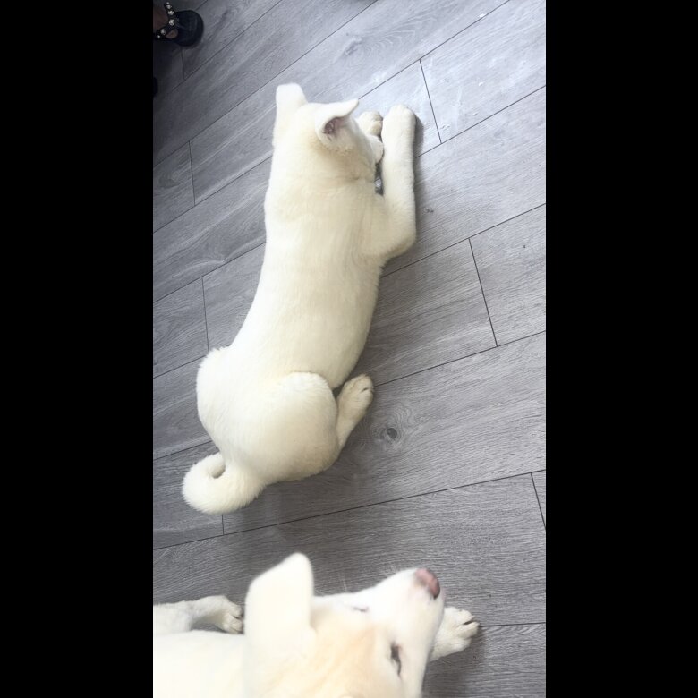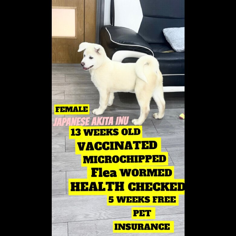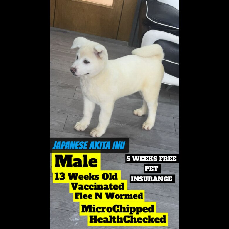 Adorable pure white Japanese Akita Inu puppies READY TO LEAVE looking for loving, permanent homes. Mother Is KC Registered Herself The mother is a show Dog 🐶 Also participated In competitions. Has Her Own Pedigree The puppies are Really healthy and well-socialized, raised in a caring environment. Some have striking blue eyes. All puppies have had there 1st Vaccine, microchip,And Flea and wormed Health Checked Each pup weigh over 6,5kg Seeking responsible owners who are knowledgeable about the breed and able to provide plenty of love and attention and care . Japanese Akitas are known for being really loyal, intelligent, and affectionate. They make excellent companions and can be protective of their family members. They are also great with children and other pets when properly raised. Born on November 22nd 2025 All Puppies are now ready to leave Mother Is pure white Japanese Akita Inu Father Is Pure White Japanese Akita Inu MALES £1000 FEMALE £1350 Can be seen with mother and father All Pups Come With 5 Weeks Free Insurance From Agria puppy Starter pack to get you started, a toy with mum’s scent, If you’re interested or need any more information, please get in touch. Serious inquiries only, please😊