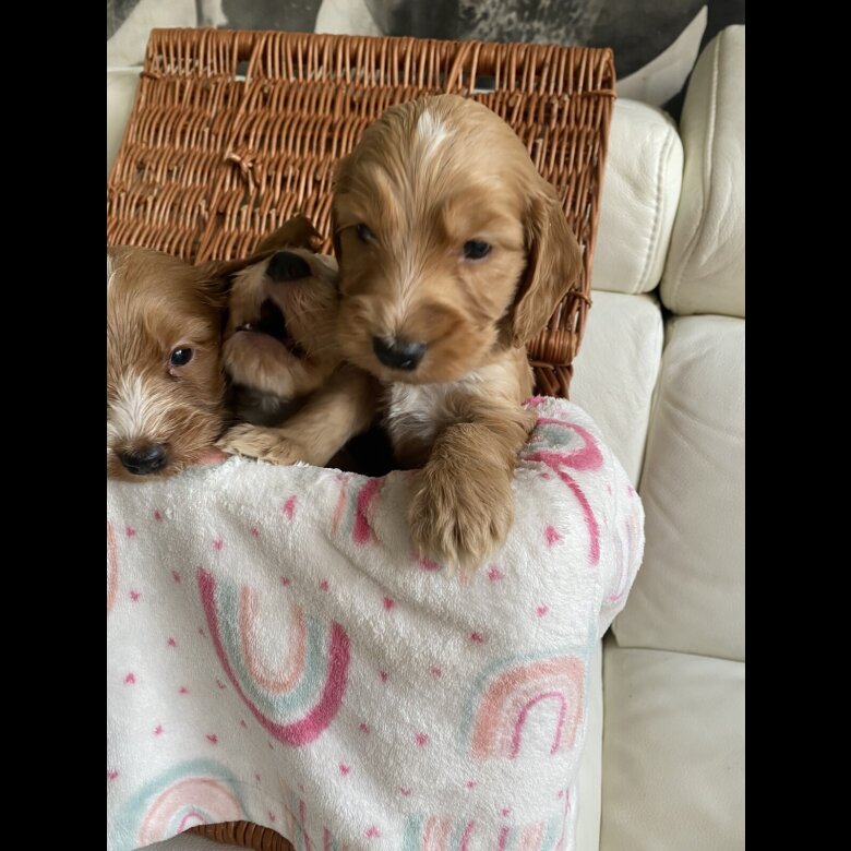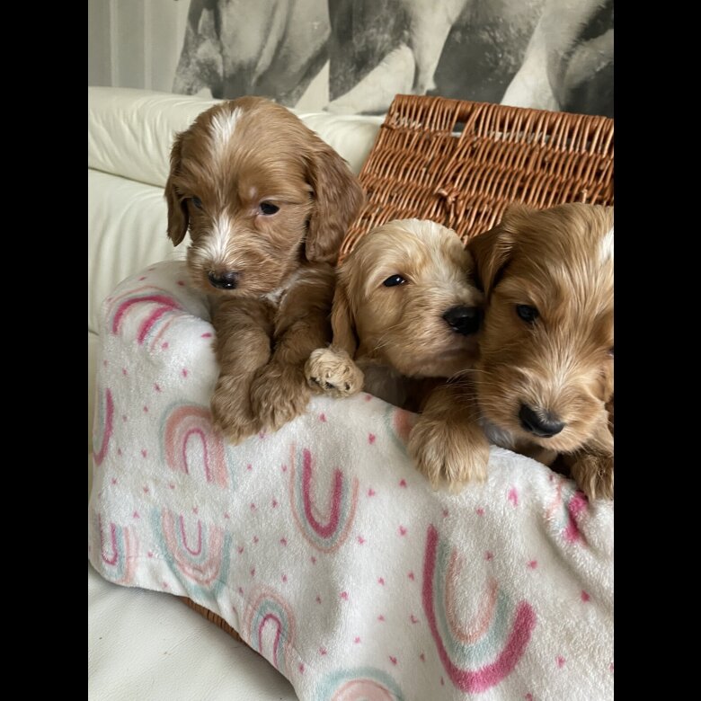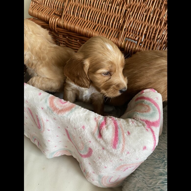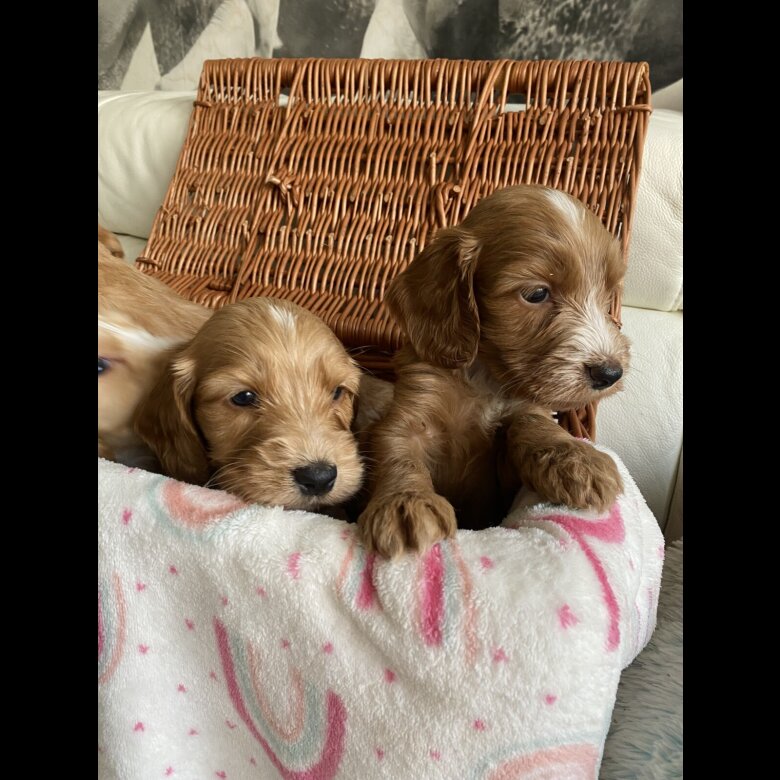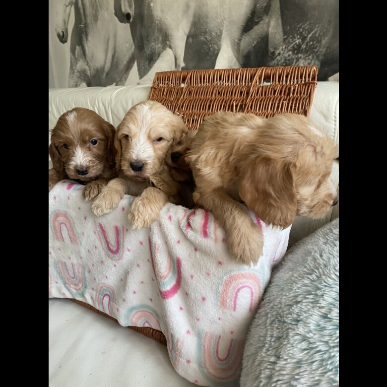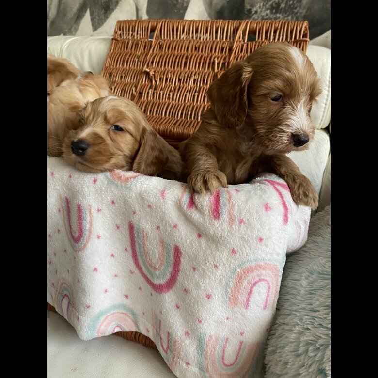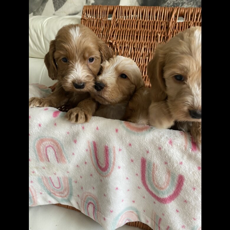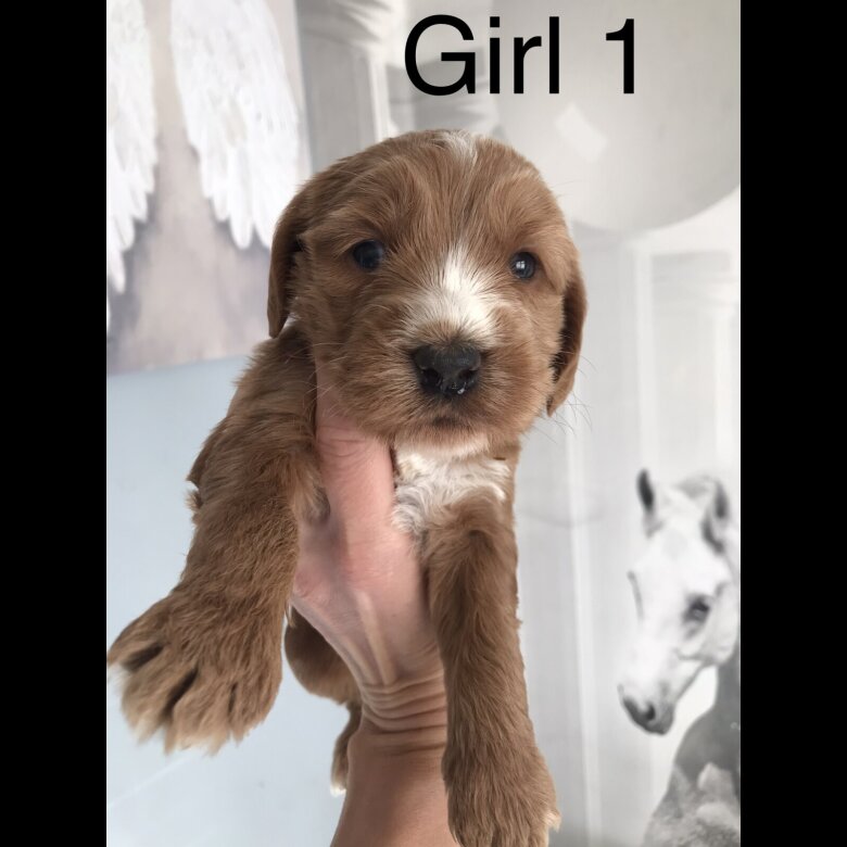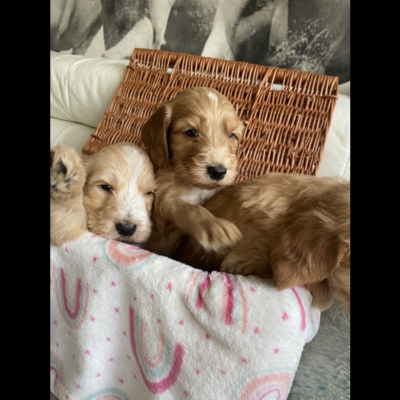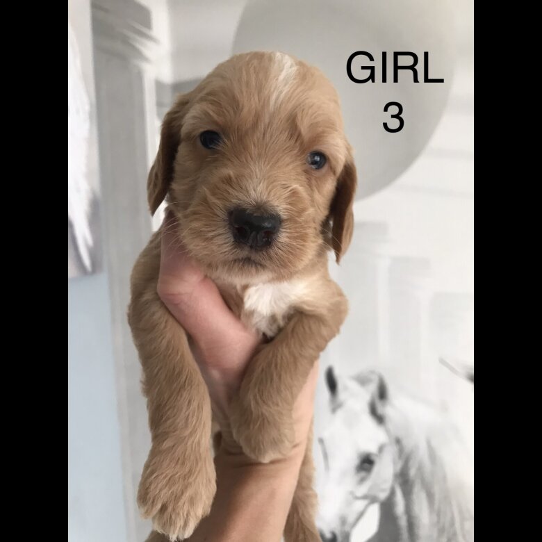 reduced price to find a forever home . 2 girls and one Boy Reserved. Beautiful babys Australian Labradoodle of 3 boys and 5 girls ready for reservation Mom; is our lovely family pets Australian Labradoodle All Health DNA Clear and Dad ; stud dog: is a KC registered Rare orange roan Show Cocker Spaniel