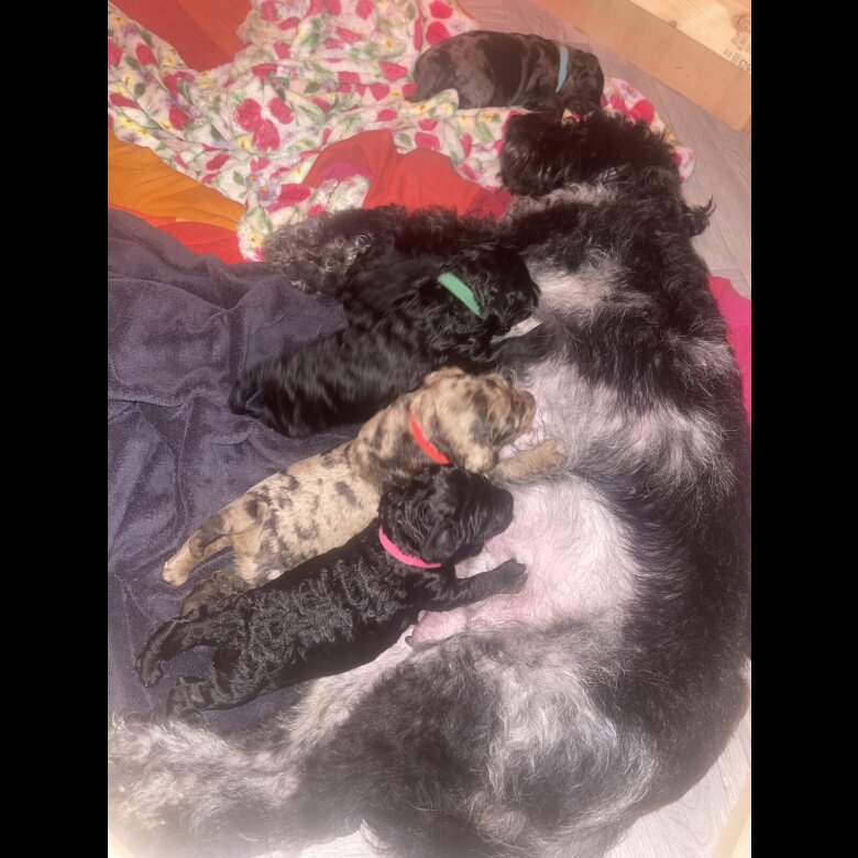 our beautiful girl has given birth to 5 stunning puppies we have 4 boys and 1 girl there dad is a miniature poodle and mum is a mini miniature Labradoodle