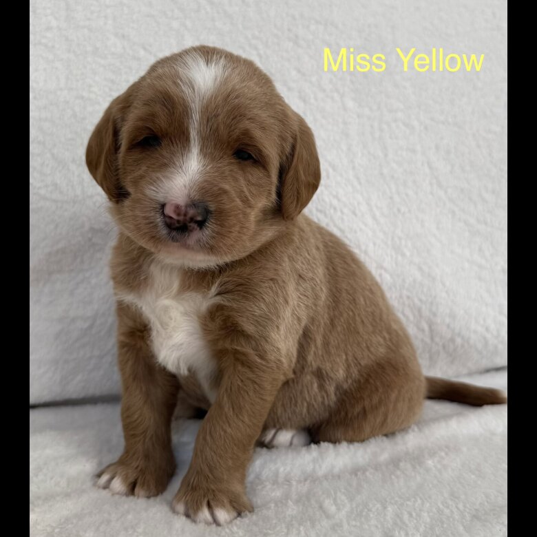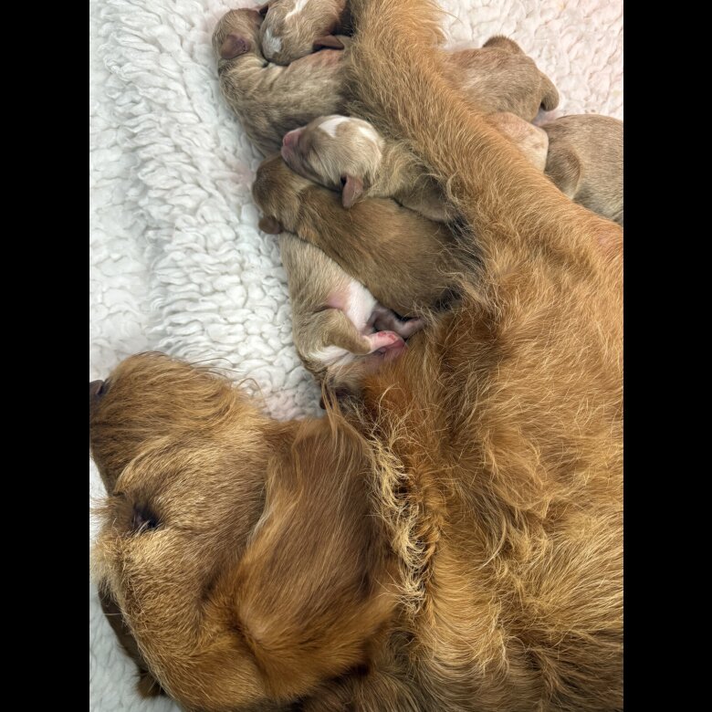 Mum to pups is our lovely gentle natured girl - Maple - her mum is a red Labrador and her dad is Rodger who’s 50% Australian labradoodle and 50% poodle. She is 19 inches to her shoulder. Mum is DNA tested all clear.