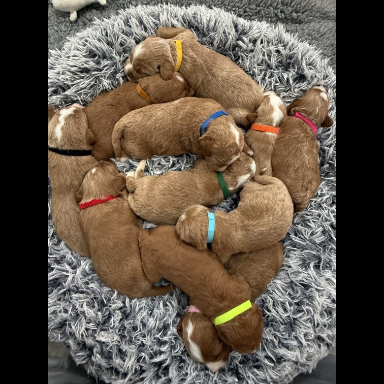 We have a stunning litter of Australian labradoodles, born 4th October. We have girls and boys available - they have the lovely markings of their dad - Randolph from Northcroft Doodles - Red and white Australian Labradoodle - 17 inches to his shoulder. He is DNA tested all clear, as well as hip and elbowed scored.