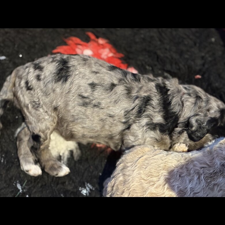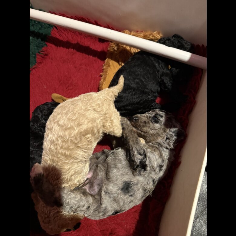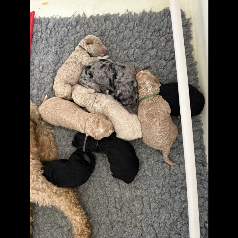 I’m a 5 star council approved registered breeder, I have been ethically breeding doodles for over 16 years, all dogs are part of the family are never given away when they have finished Breeding, I put their welfare and happiness above breeding, I make my own high quality raw food which all the puppies are brought up on. I have 6 generations of amazingly intelligent, loyal and loving Labradoodles, Please read our advert in full as we have contained a lot of information and questions you may have, if you do have any questions to ask that I haven't answered please feel free to contact me. Our beautiful Jasmine has just had her second litter. These eagerly awaited puppies will bring pleasure to any household, Jasmine is my home produced Austrailian Labradoodle and Charlie is proving to be a fantastic stud dog They will be ready to go to their new homes 28th November. A lot of time, preparation and effort goes into planning our litters we do everything correctly, including obtaining a breeding license from our council , and we are registered with the HMRC. We are completely accountable for our puppies and have strict guidelines to follow, we are inspected by our council and independent vets, and have beed awarded a 5 star licence for our breeding program, dogs and their care. Please be careful of adverts that aren't listed as "licensed breeder" as it is now a legal requirement to be licensed which people try to avoid doing, due to the time and money this costs to do. Even if you are having a "one off litter" this requires a licence . People listed as "breeder/individual" haven't been inspected to see what conditions their puppies or dogs are kept in. I have copies of my breeding license to show anybody whom is wanting to purchase one of our beautiful babies. I am pleased to announce my litter of multi generation pure / full Australian labradoodles, many people claim their dogs are Australian but they are mixes and not the real thing. pure Australian dog can’t have another poodle mix or another mix as a parent they have distinctive thick coats and amazing characters. Both parents are fully DNA health checked and clear for over 200 hereditary health conditions including Genetically CLEAR FOR : * Degenerative Myelopa SOD1 (c.100G>A) * Centronuclear myopathy HACD1 () * Gangliosidosis GM2 HEXB (c.283delG) * Hyperuricosuria SLC2A9 (c.563G>T). * Hereditary nasal parakeratosis SUV39H2 * Neonatal encephalopathy with seizures ATF2 * Osteochondrodysplasia SLC13A1 () * Progressive Retinal Atrophy (Rod-cone dysplasia 4) C17H2o * Progressive Retinal Atrophy (PRA-PRCD) PRCD (c.5G>A) * Skeletal Dysplasia 2 COL11A2 (c.143G>C) * Von Willebrand Disease I VWF (c.7437G>A. Dad is both hip and elbow scored with excellent results. Puppies are brought up in the house well socialised and housetraining will be well underway by the time they are ready to leave at 8 weeks after being health checked by a vet at their first vaccination All have beautiful shiny curly/ fleecy coats, Mum is my fully health tested pure Australian 20” caramel girl who has the sweetest nature and is very level headed and so easy to train and a really loyal and loving dog, and Dad is my fully health tested, stunning white and merle stud Dog Charlie, again he is the sweetest loving dog, very loyal and very smart and has a very low hip score and 0 elbow score. Puppies will be hereditary PRA clear so will never develop this terrible eye condition which causes blindness. Australian labradoodles are the original labradoodle service dogs who are calmer than British labradoodles have none shedding fleecy coats its taken me a long time to select the right dogs to start this breeding program, all the puppies wonderful fleecy none shedding hypo allergenic coats and really strong and healthy hips and eyes, When fully grown I am expecting them to be around 18-20” to the shoulder, easy to train and incredibly loving. I am an ethical breeder and all my puppies live in the house and are pets and family members fiall my dogs are pets first. I have testimonials from owners who are very pleased with their dog, which I can share with you. I as a breeder have gone above and beyond my requirements, including doing training and courses so I am qualified in canine pregnancy, whelping and also dog and puppy first aid as well as 16+ years hands on breeding experience. All of our puppies come with a health guarantee giving you peace of mind (terms in our puppy contract). We do everything in our power to ensure you receive a healthy happy puppy, Your potential puppy will be born inside our family home and have around the clock care, they will never be left home alone, your puppy will be used to the hussle and bussel of family life and will be handled daily. They will be wormed at 2/4/6/8 weeks, have flea treatment as a precaution, receive a vet check, microchip, first vaccination and 4 weeks insurance. Your puppy will come with a puppy pack , just to name a few things it will include: puppy contract, copies of both parents health tests , food , collar , scent blanket Please note our puppies will be sold as pets / members of the family, not too breeding homes Puppies will be available to view via videocall now, and a £500 none refundable deposit secures your bundle of fun. all initial viewings will be via video you can see more about me on my facebook and website for more information call, ****