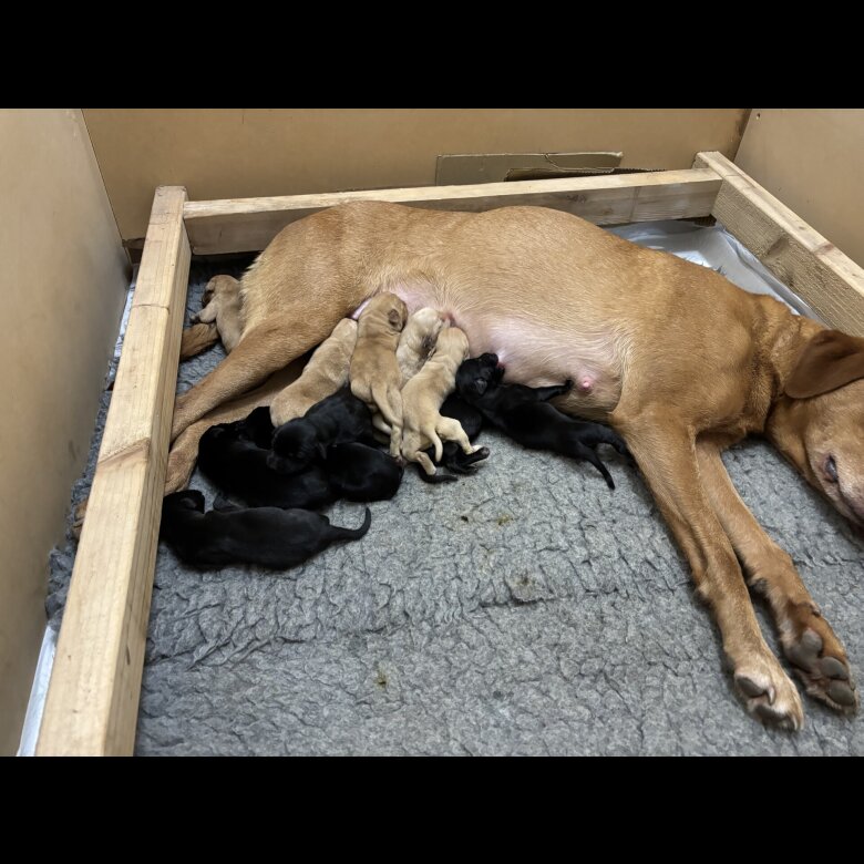 Our gorgeous Pippa (Red) and stunning Ralphy (Black. Sired by Gwyrchbedw Bobi Jack ) have a litter of 11 KC Reg Labrador puppies. Although parents are not used as working dogs they both from working lines.