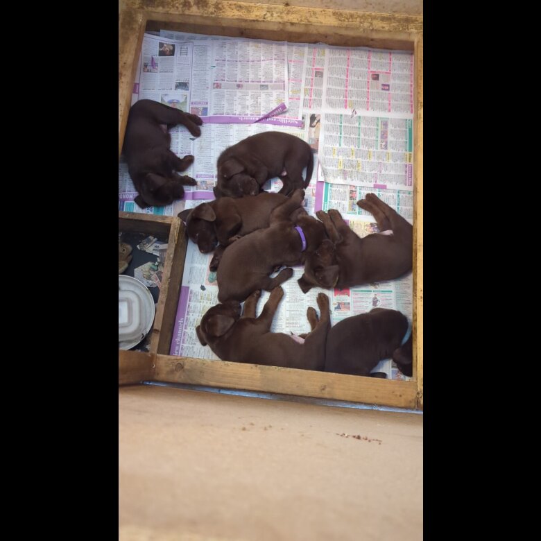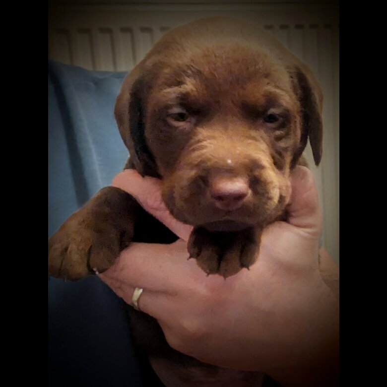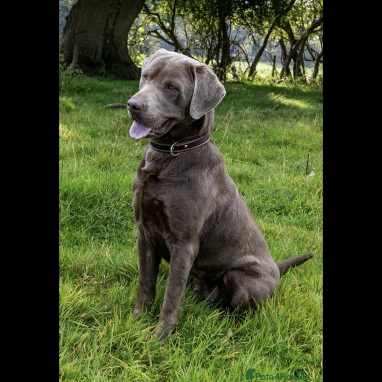 For sale 2 bitches and 2 boys left from litter of 7 pups . Well bred chunky show type labs . Mum chocolate is family pet. Dad is silver stud dog. . Puppies ready next week. Will be micro chipped. Wormed. Fleed , weaned and cleaned. Come with puppy pack . Also paper trained .