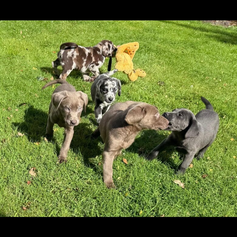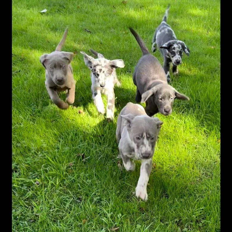 We have a “rainbow” selection of puppies including a variety of merle (spotted) as well as gorgeous black, charcoal and silver. Sally’s chunky, fluffy little ones are growing well and starting to develop their own personalities. They are all sociable and confident and very much looking forward to finding their forever homes. They will be wormed and microchipped and will leave with a “puppy pack” including some food they are used to and a blanket that will be rubbed on mum to help them settle.