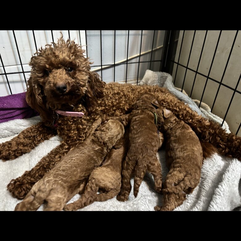Puppies were born on 10th December 2025, all arrived safe and well, they are progressing great and gaining weight. Puppies are all a gorgeous dark red colour, boasting their gorgeous coats which are starting to come in thicker and curly already!
