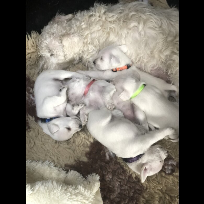 My beloved girl Ellie as had 5 adorable puppies, 3 girls and 2 boys all white litter. Mum white and father (stud)white. I am looking for committed new owners who can give lifelong loving homes.