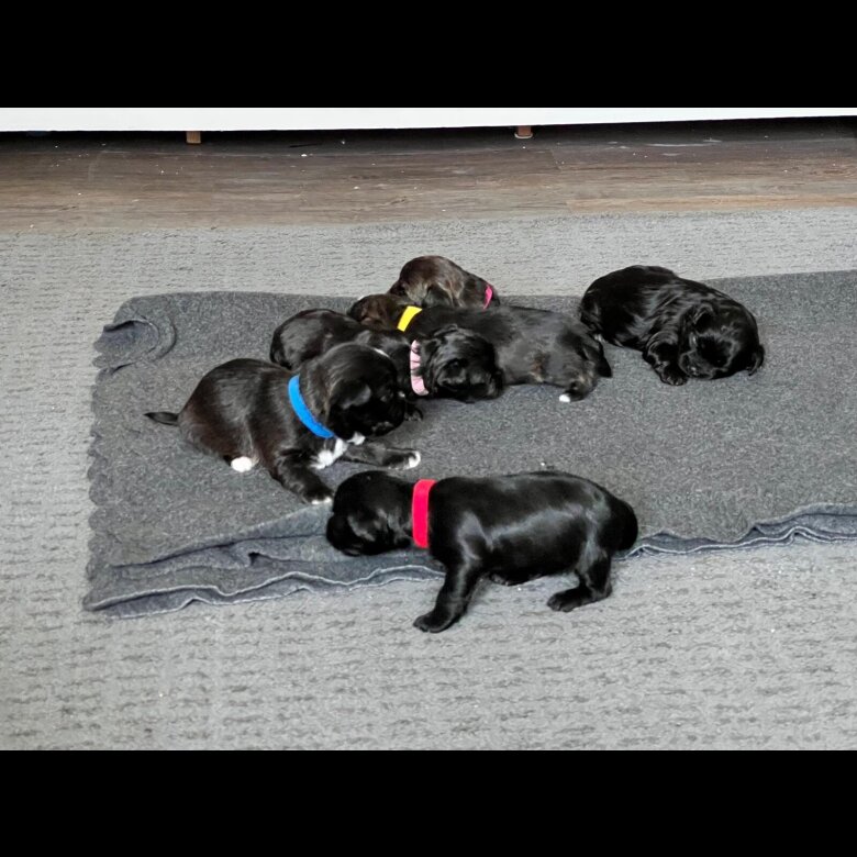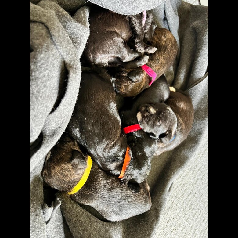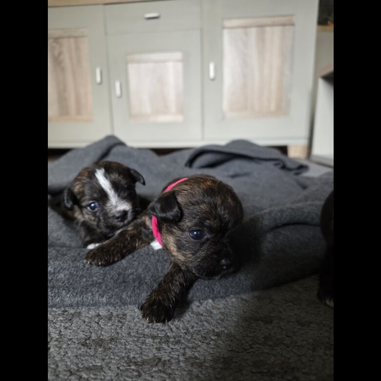 Beautiful litter mums a boston x dads a poodle mix good solid pups. 3 brindle 3 black