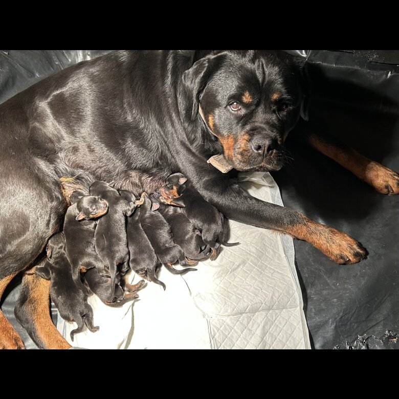 Both mum and dad have excellent bone structure and strong breed characteristics. The puppies and mum are all doing extremely well. Our pups will make amazing family companions and are already growing into big, chunky Rottweilers.