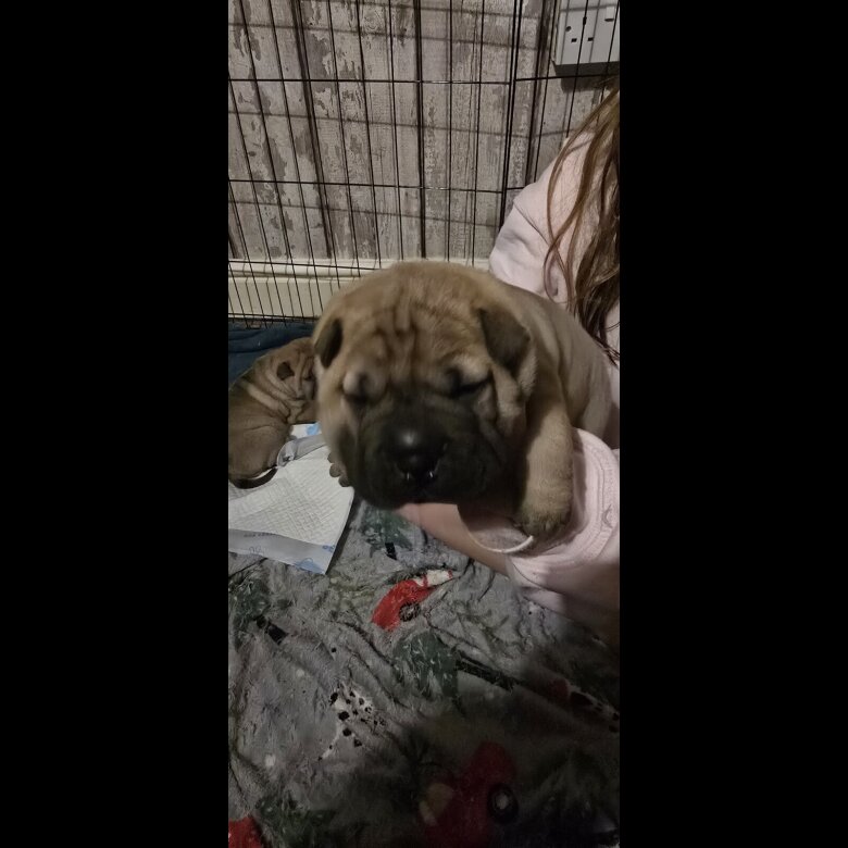 2 female shar pei puppies lovely colouring with a nice black strip down there backs looking for a good home will be vaccinated wormed and vet checked before hand over will be ready 28/3/26 both fully mobile feeding well video available on request price is negotiable