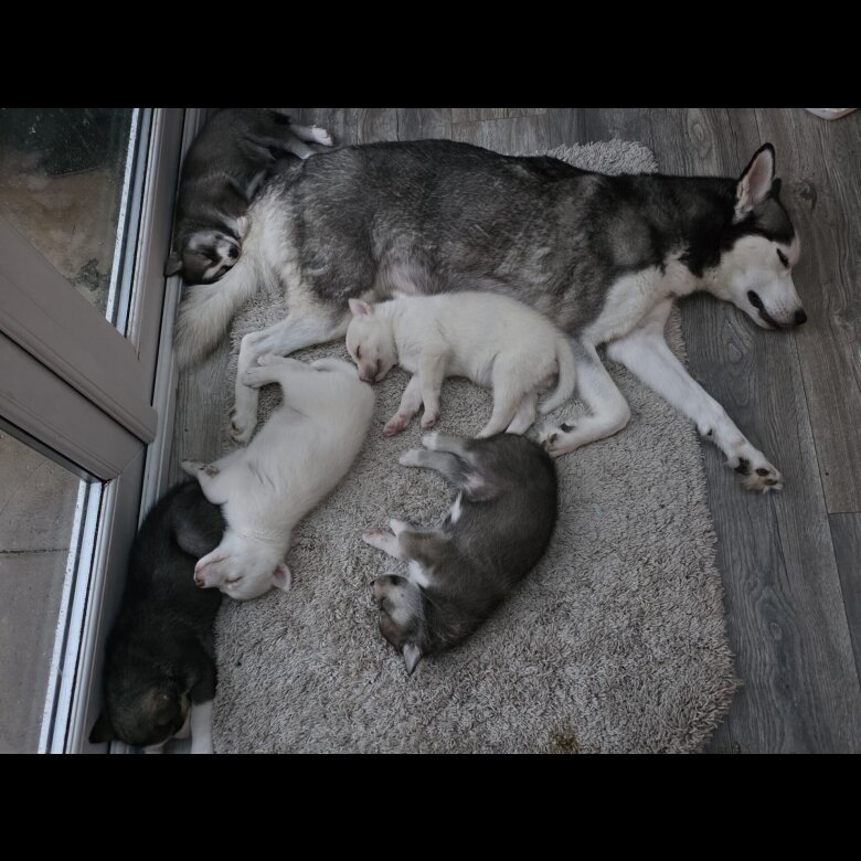 Our beautiful girl delivered 7 stunning puppies all mixed colours (grey, white and sable)4 girls and 3 boys, all blue eyes. 1 male and 2 female available for rehoming.