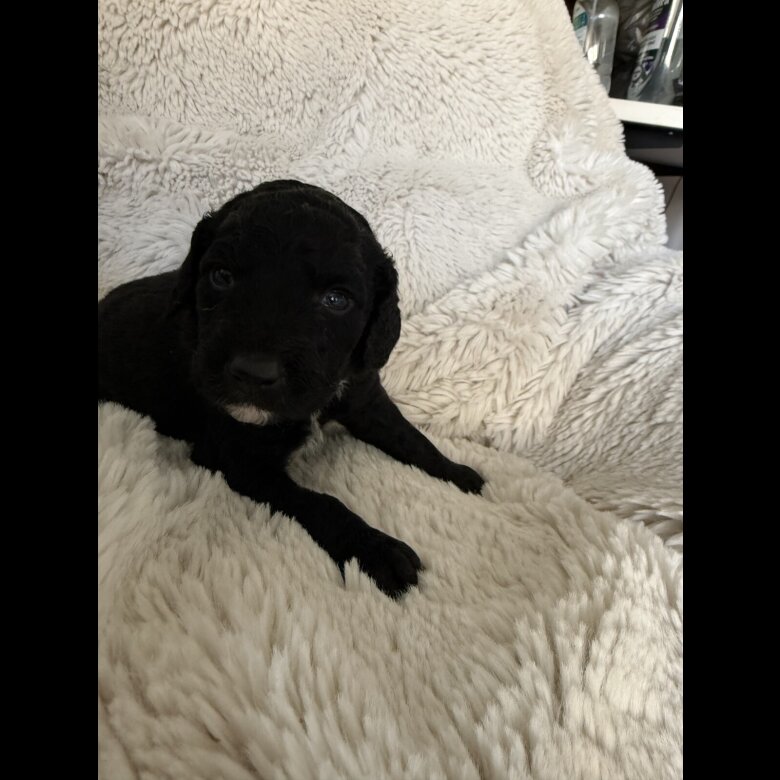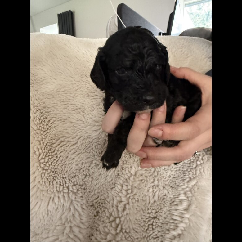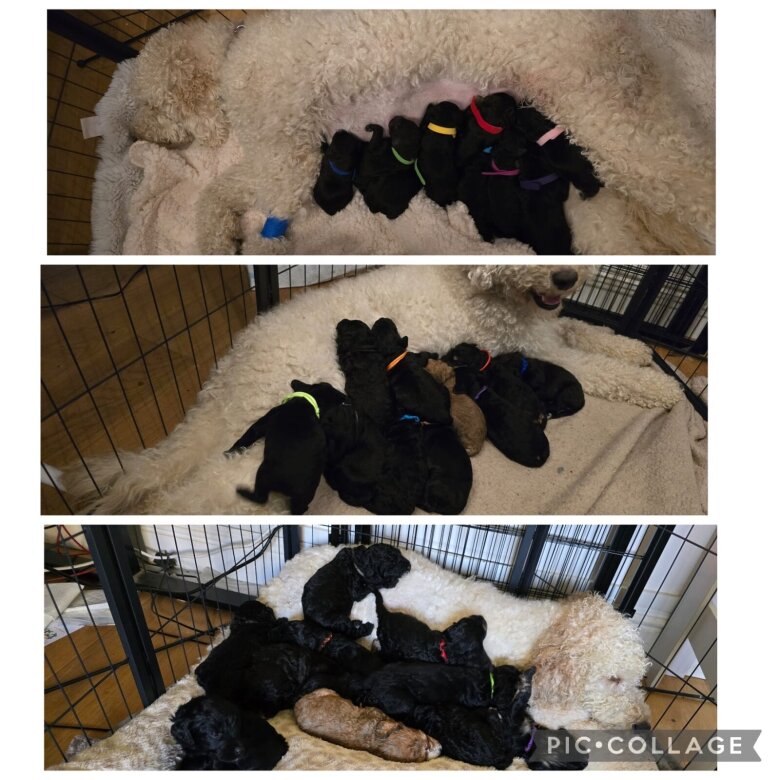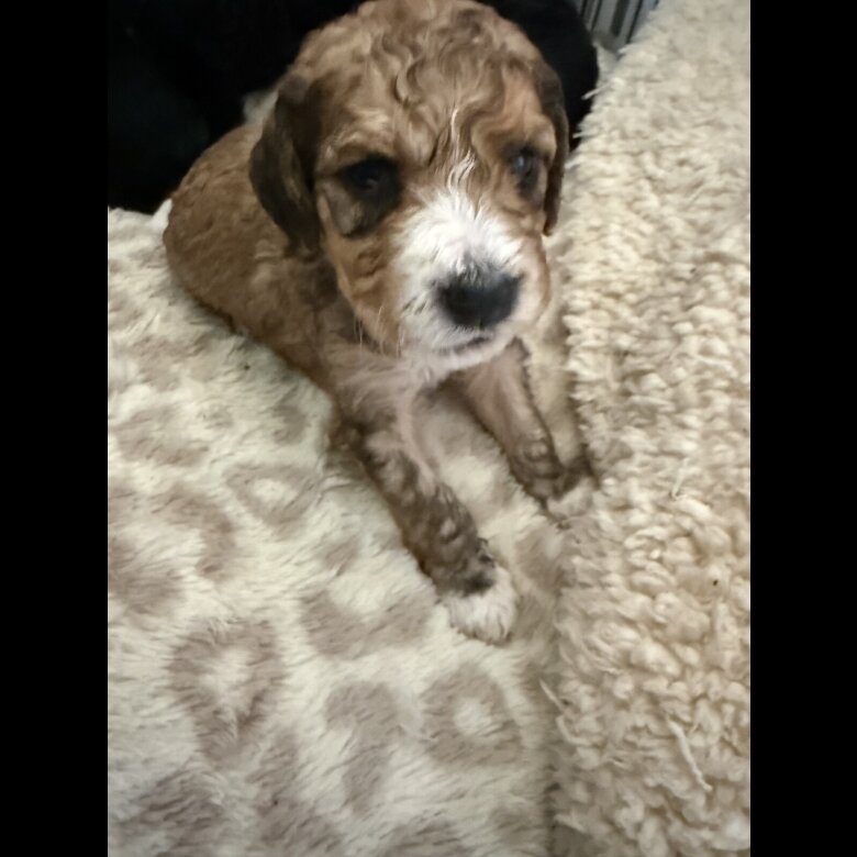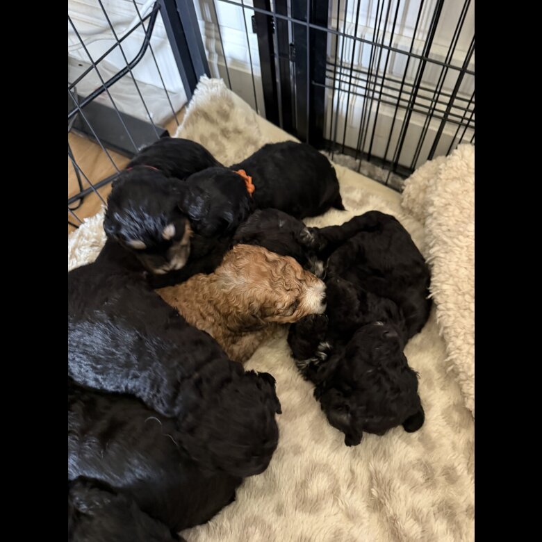 Mum is a cream/beige large St Bernard cross standard poodle f1 dad is a chocolate medium printer cross poodle f1 (carries phantom gene)