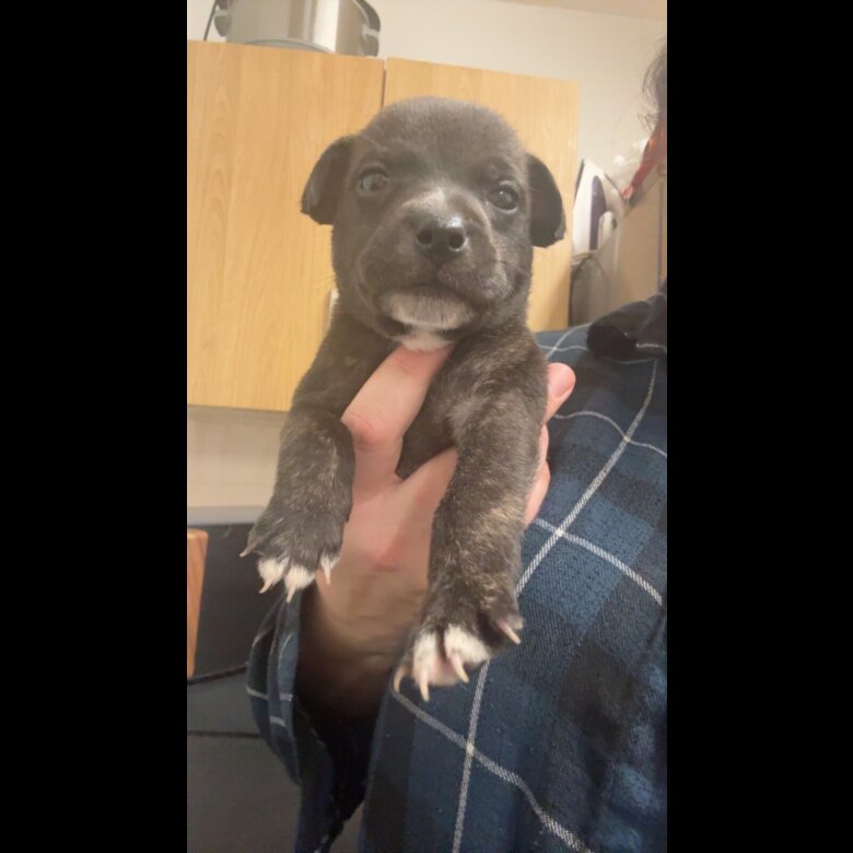 He’s a beautiful little brindle boy with a little white chin.